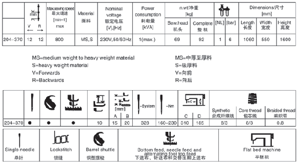 Uses:The GA204 class sewing machine with large barrel shuttle has been specially designed for processing the extreme thread and material thicknesses of heavyweight materials.Seams of leather goods,the manufactring of technical textiles and special sewing tasks when processingleather products and uplolstery,are among the extensive range of applications of 204.